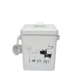 Yaratıcı desen özelleştirilmiş kedi köpek maması saklama kutusu Metal Pet gıda saklama kabı kepçe ile raf
